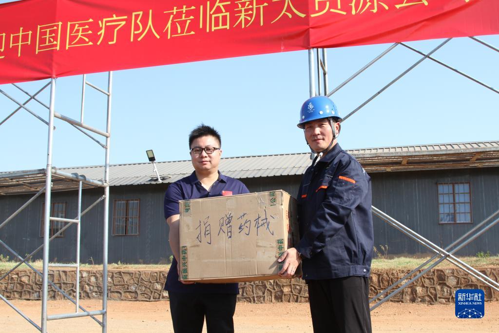 11月21日,在津巴布韋南部邊境地區的新太資源棕櫚河冶金產(chǎn)業(yè)園,中國醫療隊向園區內中企贈送藥品。