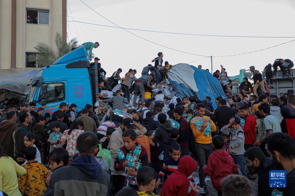 11月21日,在加沙地帶南部城市汗尤尼斯,民眾領(lǐng)取飲用水。