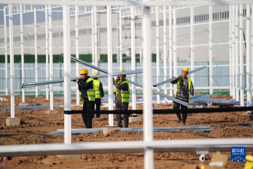 工人在進(jìn)行饒陽(yáng)縣農村產(chǎn)業(yè)融合發(fā)展示范園項目施工(11月20日攝)。