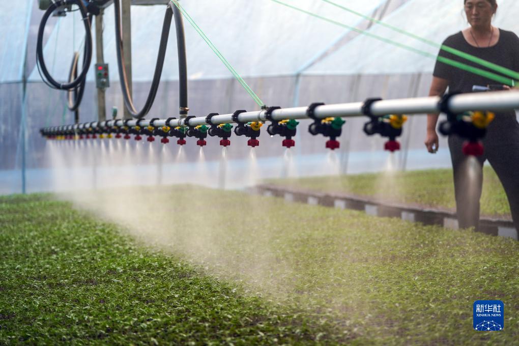 在饒陽(yáng)縣大尹村鎮南北巖村一個(gè)新建的全鋼架無(wú)立柱新型日光溫室里,自動(dòng)噴淋裝置正在給西紅柿幼苗澆水(11月20日攝)。