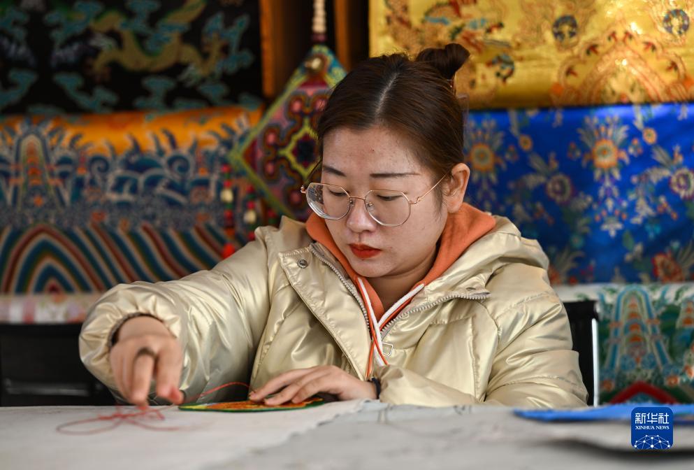 11月16日,在內蒙古阿拉善盟阿拉善左旗的馬鬃繞線(xiàn)蒙古族唐卡傳習所,一名學(xué)徒在制作蒙古族唐卡。