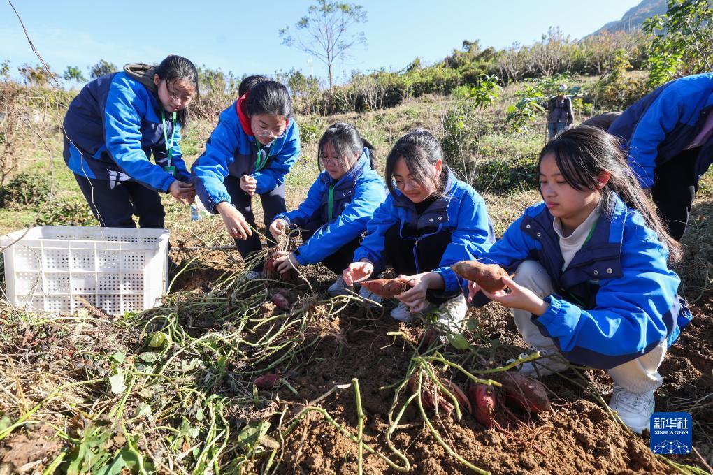 11月22日,學(xué)生在趙家鎮花明泉村明樂(lè )果業(yè)實(shí)踐基地收番薯。