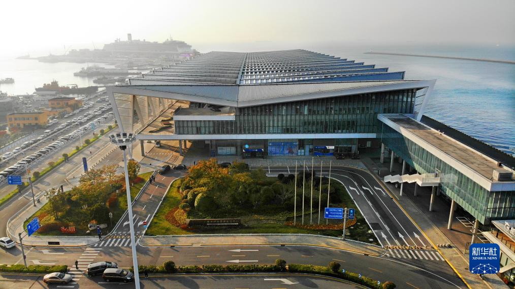 這是總建筑面積6萬(wàn)平方米的青島郵輪母港客運中心。其設計最高通關(guān)能力可達每小時(shí)3000-4000人次,年接待能力達150萬(wàn)人次。主要功能為聯(lián)檢大廳,同時(shí)配套免稅商店等商業(yè)服務(wù)功能(11月21日攝,無(wú)人機照片)。