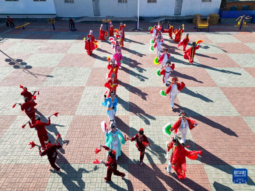 河北省灤州市葛莊村地秧歌隊隊員在村廣場(chǎng)上表演(11月17日攝,無(wú)人機照片)。