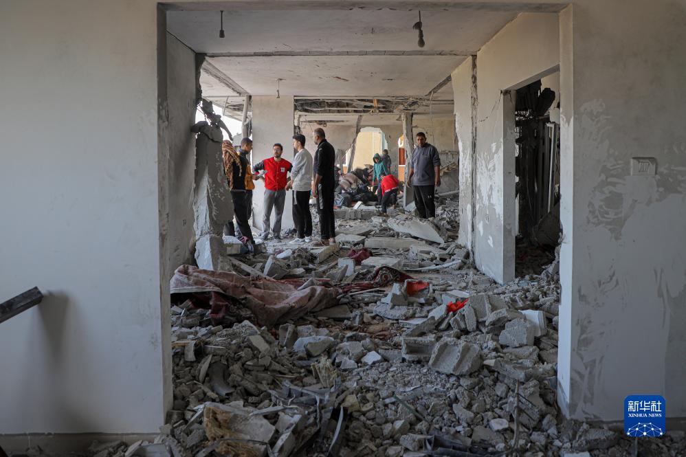 11月22日,在加沙地帶南部城市汗尤尼斯,巴勒斯坦人查看遭以色列襲擊后的建筑廢墟。