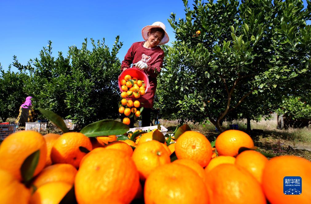11月22日,江西省宜春市靖安縣水口鄉桃源村農民在采收靖安蜜橘。
