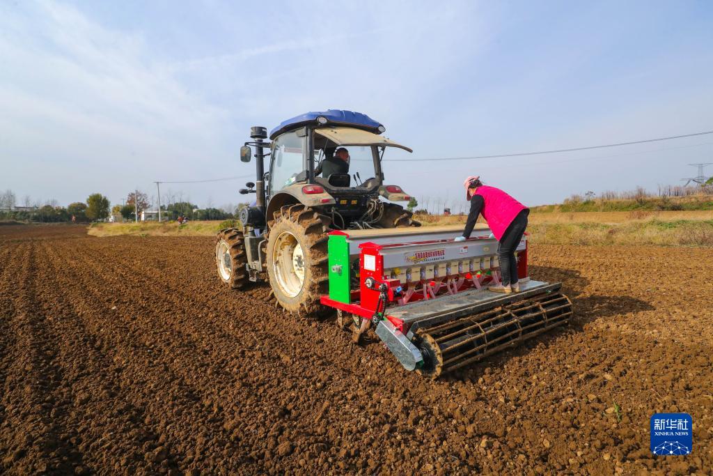 11月22日,在河南省信陽(yáng)市光山縣十里鎮永輝高效示范園種植基地,農民駕駛播種機播種小麥。