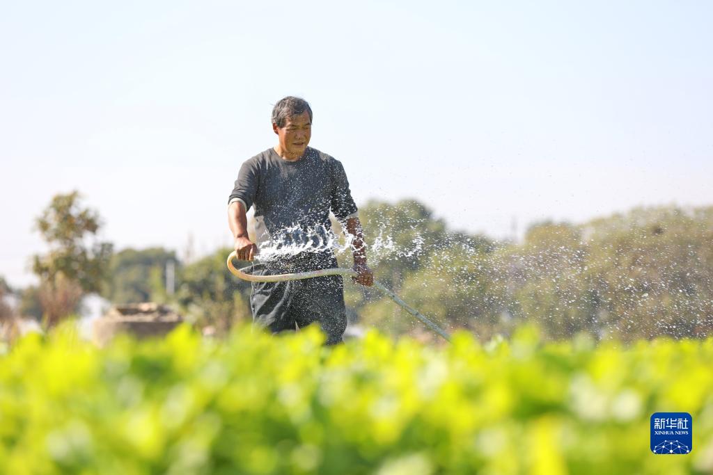 11月22日,在浙江省嘉興市南湖區七星街道一處農田里,農民在澆灌雪菜。