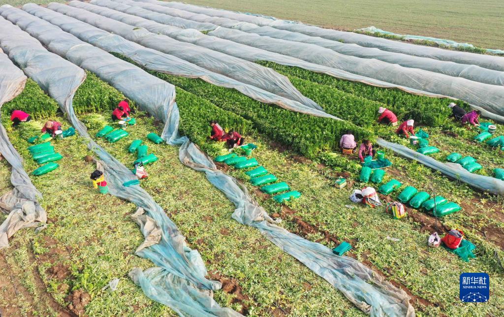 11月22日,在河北省邢臺市南和區東三召鄉南頭村,菜農們在收獲芹菜(無(wú)人機照片)。