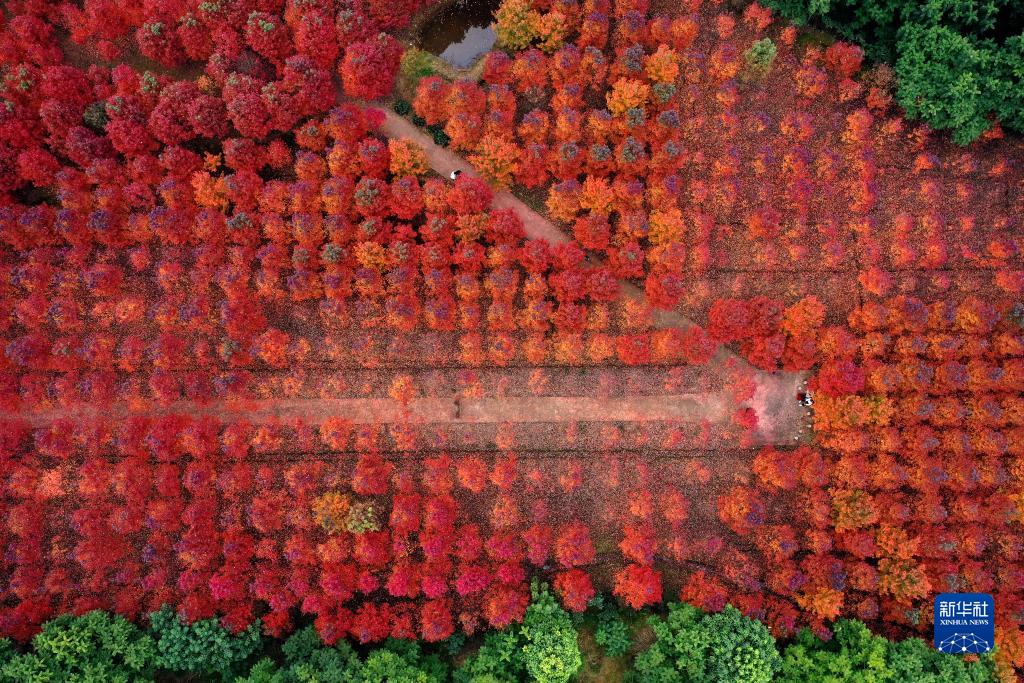 11月21日,游客在四川省眉山市東坡區太和鎮元寶村億嘉林木基地游玩(無(wú)人機照片)。