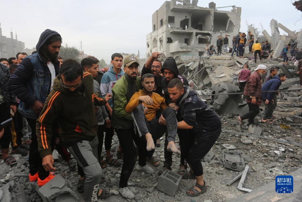 11月22日,人們在加沙地帶南部城市拉法的建筑廢墟上實(shí)施救援。