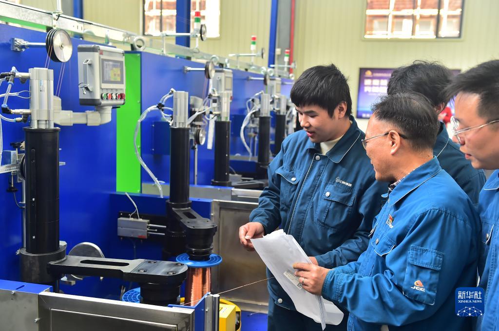 11月21日,在江西江銅華東電工新材料科技有限公司生產(chǎn)車(chē)間,技術(shù)工人在生產(chǎn)線(xiàn)上探討技術(shù)問(wèn)題。