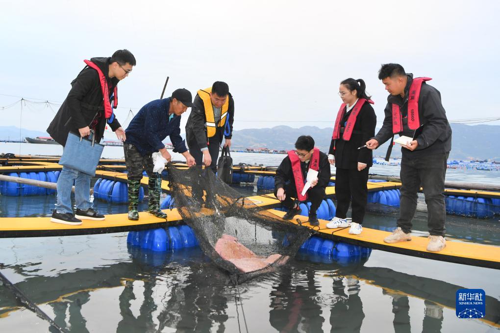 11月14日,福建省寧德市霞浦縣溪南鎮七星海上社區黨支部書(shū)記吳德枝(左三)帶領(lǐng)工作人員在轄區漁排走訪(fǎng),了解海上養殖戶(hù)需求。