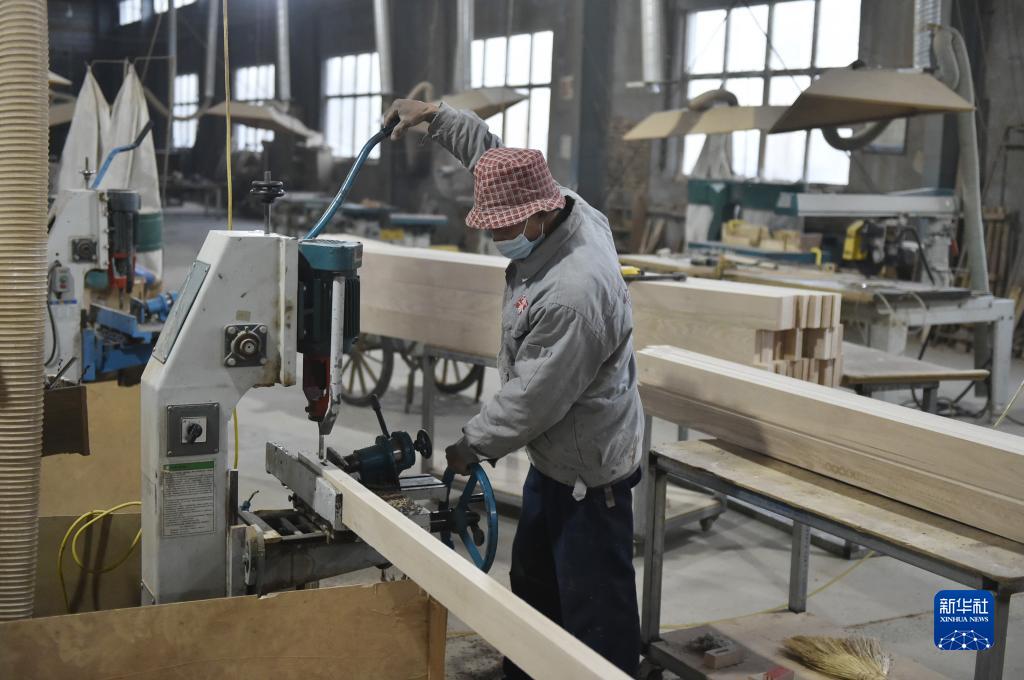 11月22日,工人在滑縣半坡店古典家具特色小鎮內一家企業(yè)的生產(chǎn)車(chē)間加工木料。