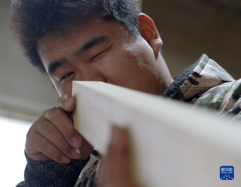 11月22日,工人在滑縣半坡店古典家具特色小鎮內一家企業(yè)的生產(chǎn)車(chē)間內加工木料。
