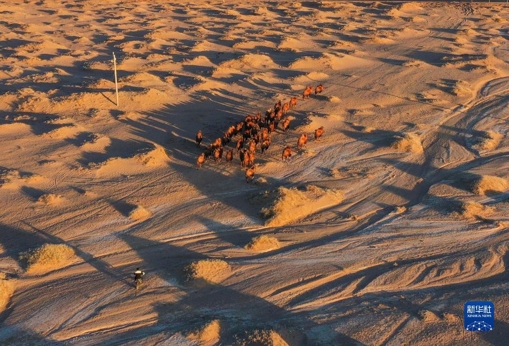 在內蒙古阿拉善左旗烏力吉蘇木溫都爾毛道嘎查,牧民朝勒門(mén)格爾勒(左下)騎著(zhù)摩托車(chē)放駱駝(11月17日攝,無(wú)人機照片)。