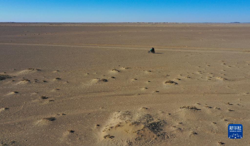 在內蒙古阿拉善左旗烏力吉蘇木溫都爾毛道嘎查,牧民朝勒門(mén)格爾勒和兒子溫都蘇在巡護邊境區域(11月17日攝,無(wú)人機照片)。