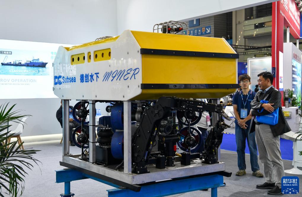 11月23日,觀(guān)眾在展覽現場(chǎng)了解大型作業(yè)級水下機器人。