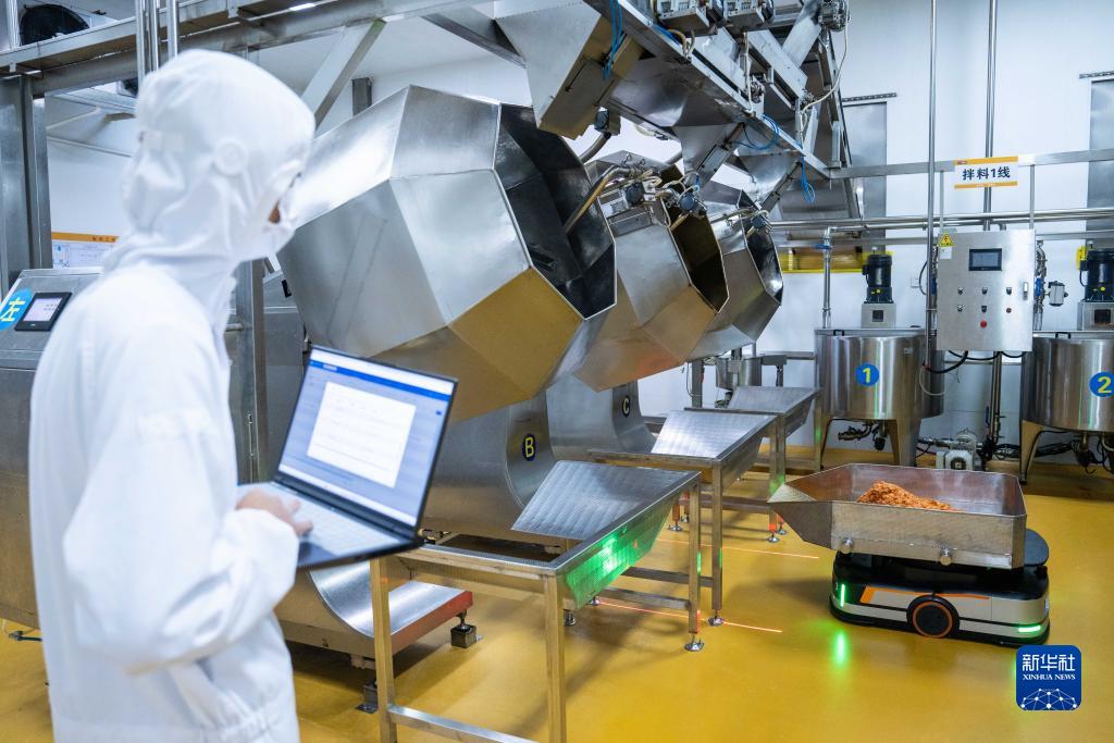11月23日,在鹽津鋪子瀏陽(yáng)生產(chǎn)基地,工人操作電腦控制機器人運輸半成品。