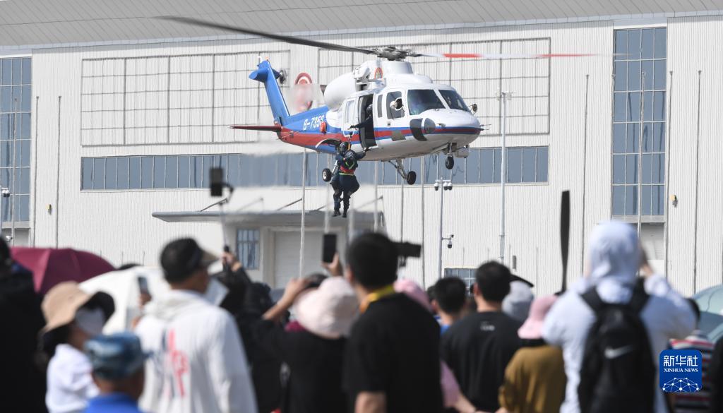 11月23日,交通運輸部南海第一救助飛行隊在2023亞洲通用航空展開(kāi)幕式上進(jìn)行空中救援演示。