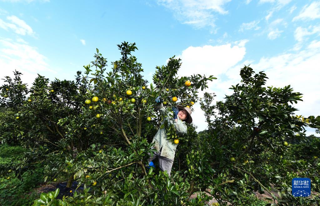 工作人員在海南農墾龍江農場(chǎng)有限公司白沙紅橙現代農業(yè)示范基地采摘白沙紅橙(11月22日攝)。