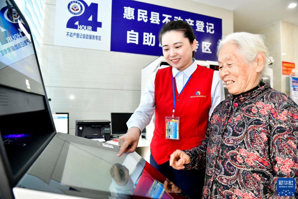 11月23日,在惠民縣政務(wù)服務(wù)中心,“紅馬甲”服務(wù)專(zhuān)員幫助一名老人辦理相關(guān)業(yè)務(wù)。