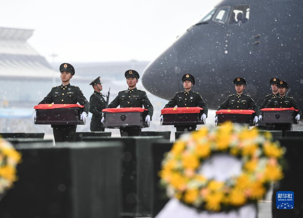 當日,第十批在韓中國人民志愿軍烈士遺骸由我空軍專(zhuān)機護送從韓國接回遼寧沈陽(yáng),25位志愿軍烈士遺骸及相關(guān)遺物回到祖國。