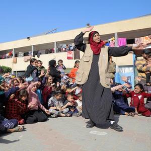 這是11月23日在加沙地帶南部城市汗尤尼斯拍攝的與當地志愿者互動(dòng)的兒童。