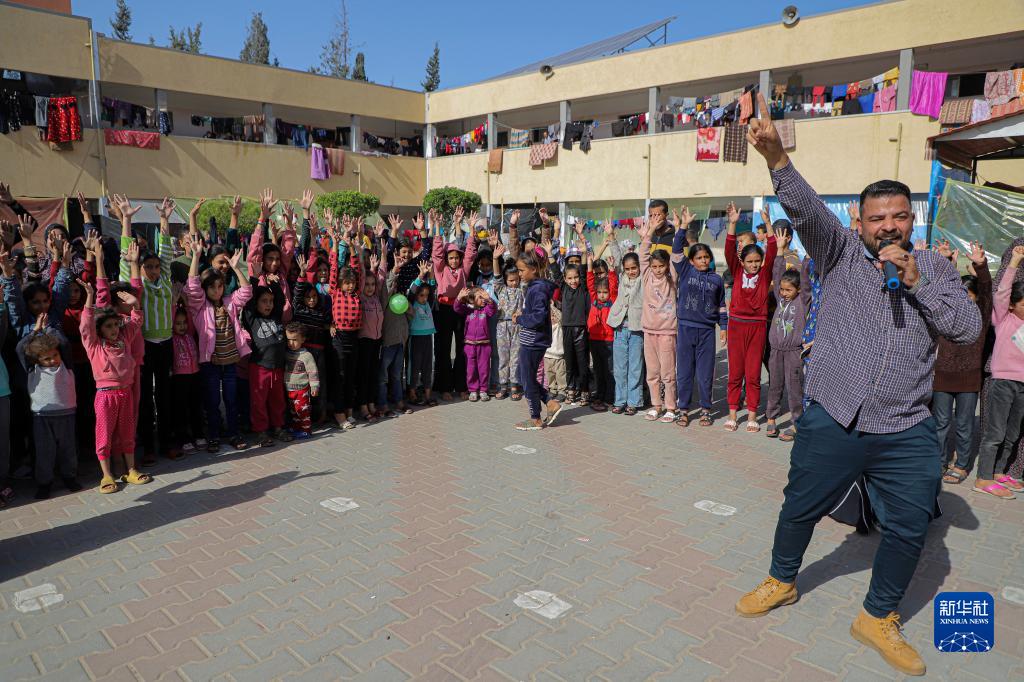 11月23日,在加沙地帶南部城市汗尤尼斯,當地志愿者和兒童進(jìn)行互動(dòng)。