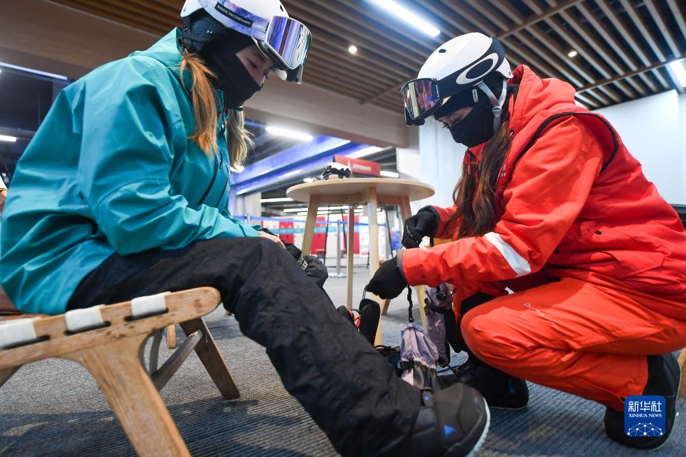 11月24日,在北大湖滑雪度假區,王雪(右)在幫學(xué)員穿戴滑雪裝備。