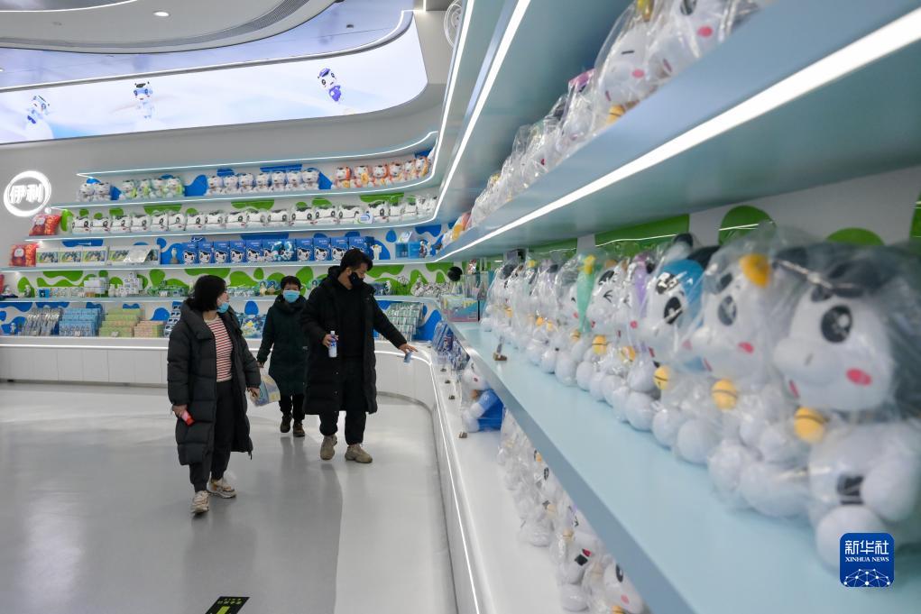 11月23日,在呼和浩特市伊利現代智慧健康谷智造體驗中心,游客在挑選乳制品和文創(chuàng )產(chǎn)品。