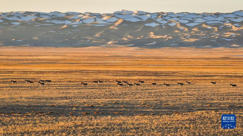 阿爾金山國家級自然保護區,藏野驢在灑滿(mǎn)陽(yáng)光的草原上奔馳(10月18日攝,無(wú)人機照片)。