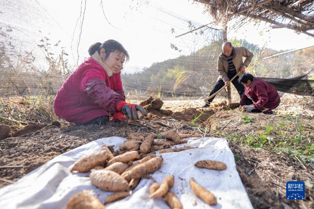 11月23日,在湖北省羅田縣九資河鎮葫蘆石村,藥農在田里收獲天麻。