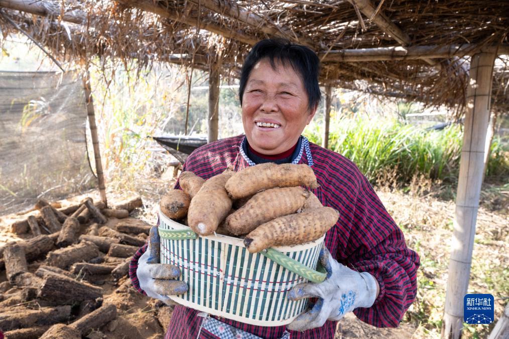 11月23日,在湖北省羅田縣九資河鎮葫蘆石村,藥農展示收獲的天麻。