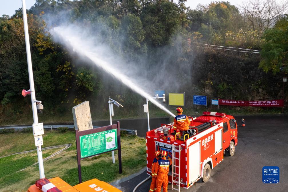 11月24日,在長(cháng)沙象鼻窩森林公園,應急救援員在演練中向模擬起火點(diǎn)噴水(無(wú)人機照片)。