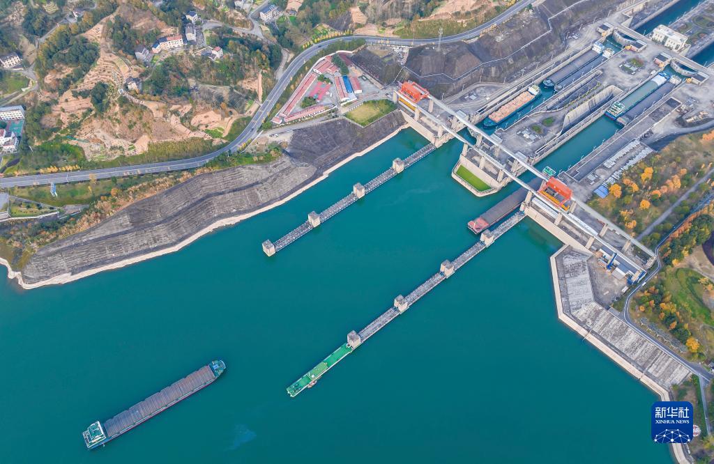 11月24日,船舶有序通過(guò)三峽雙線(xiàn)五級船閘(無(wú)人機照片)。