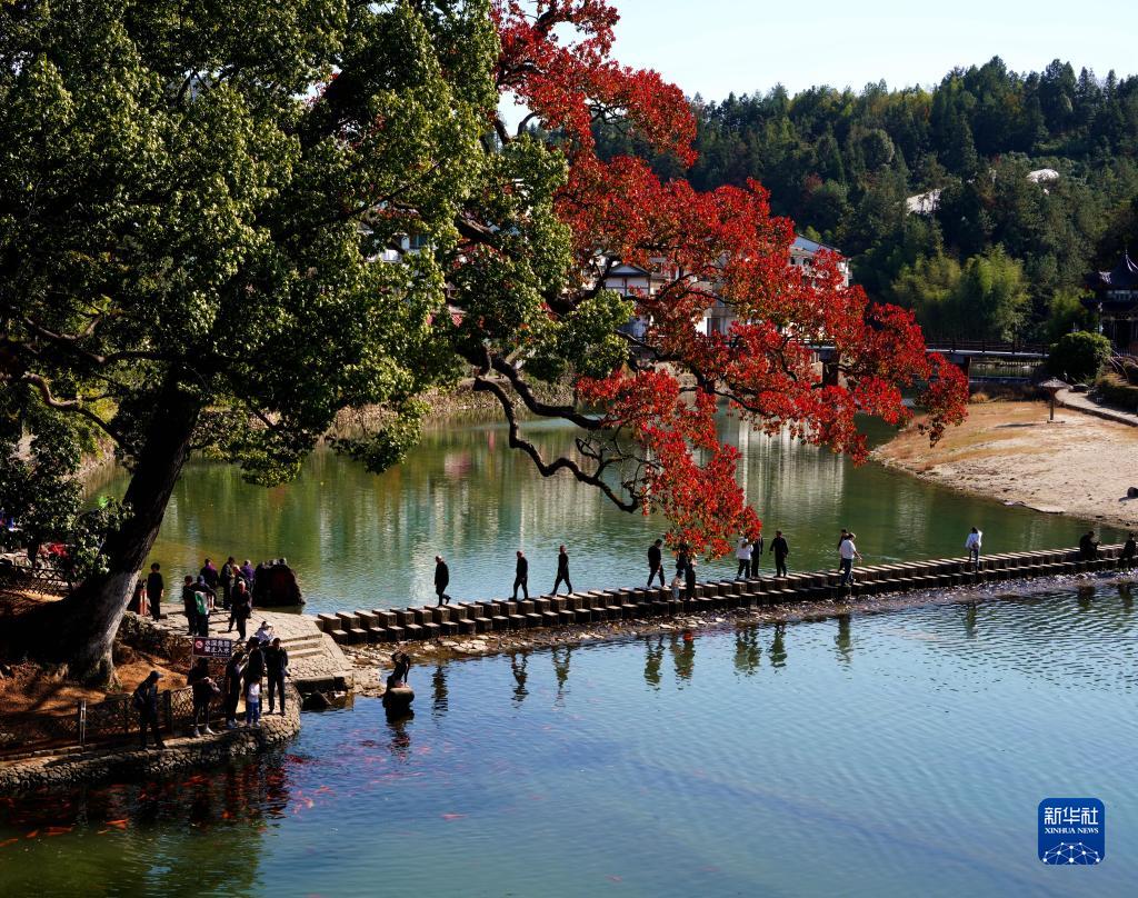 11月23日,游客在浙江省溫州市泰順縣泗溪鎮北澗橋邊觀(guān)賞樹(shù)齡千年的烏桕樹(shù)。