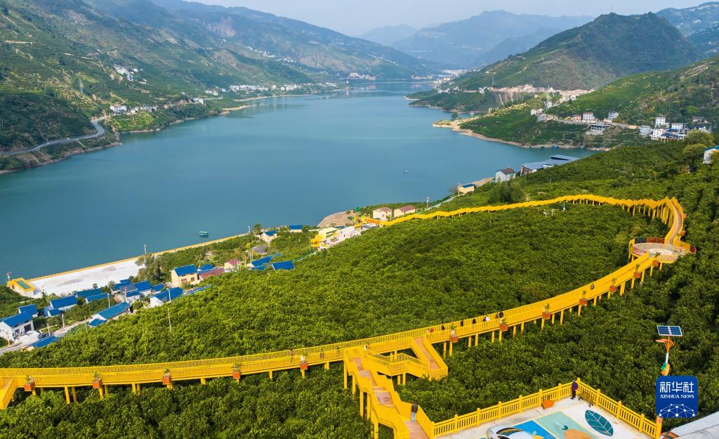 11月24日,游客在湖北省宜昌市秭歸縣歸州鎮彭家坡村臍橙園的觀(guān)光廊道上游覽(無(wú)人機照片)。