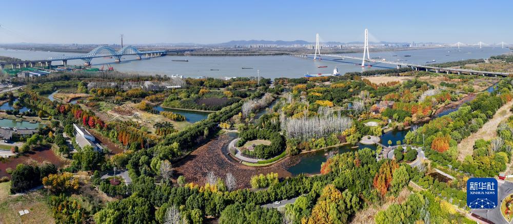 11月24日拍攝的位于江蘇省南京市雨花臺區的三橋濕地公園(無(wú)人機全景照片)。