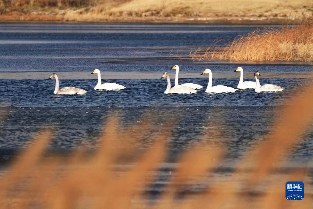 11月24日,幾只遷徙來(lái)的白天鵝在甘肅省張掖市甘州區城北郊濕地公園湖水中棲息覓食。