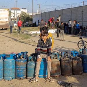 11月24日,在加沙地帶南部城市拉法,人們排隊等待充天然氣。