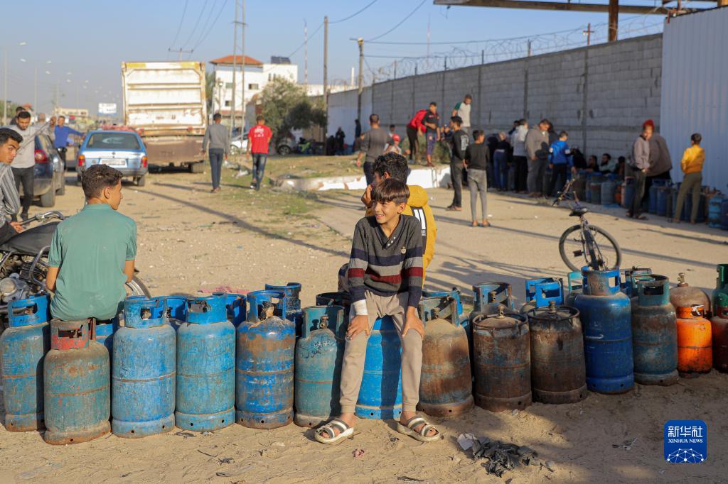 11月24日,在加沙地帶南部城市拉法,人們排隊等待充天然氣。