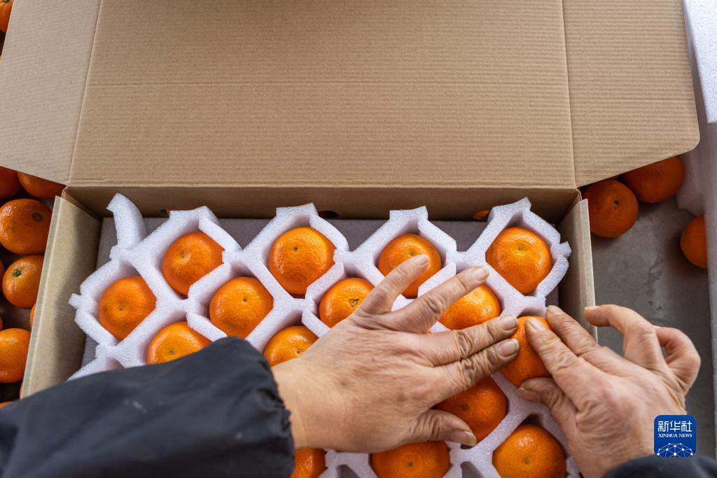 11月24日,在重慶市開(kāi)州區竹溪鎮大海村的一個(gè)柑橘種植基地,村民在將采摘的砂糖橘裝盒。