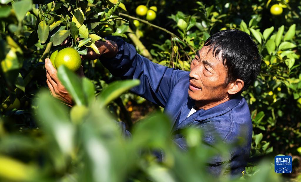 工作人員在瓊中黎族苗族自治縣的一處綠橙種植基地采摘瓊中綠橙(11月24日攝)。