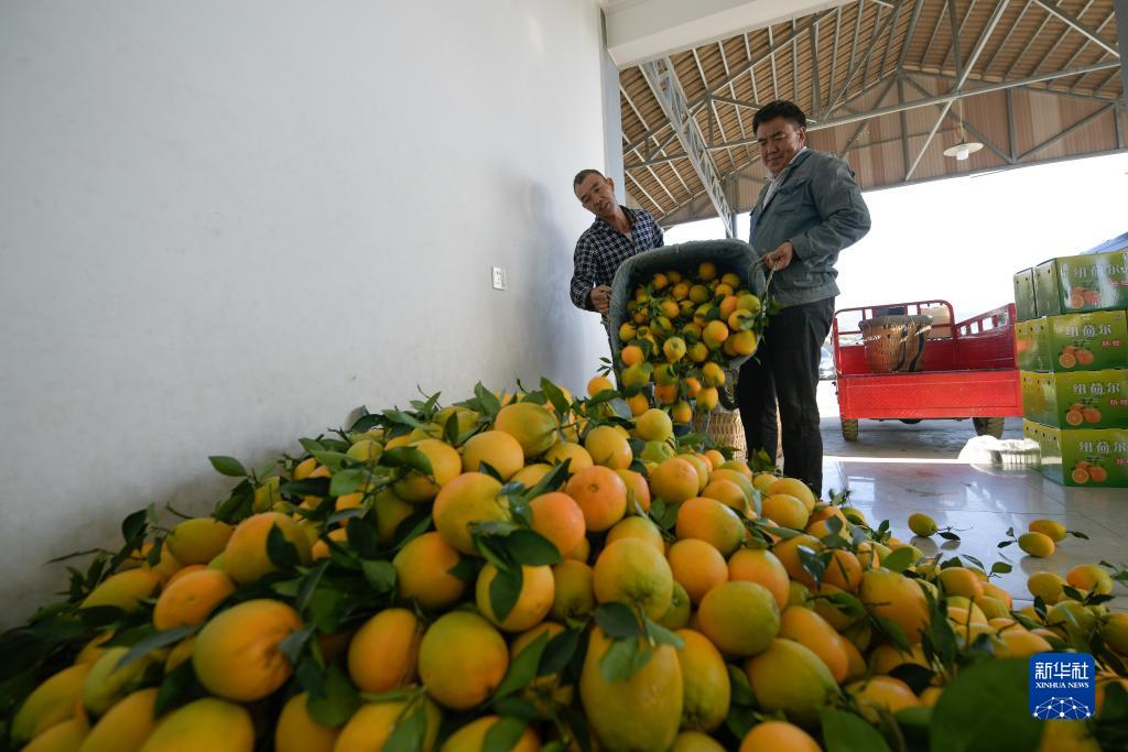 11月25日,在四川鹽邊縣紅格鎮益民村的紐荷爾臍橙基地,果農將臍橙運至空地等待分揀包裝。