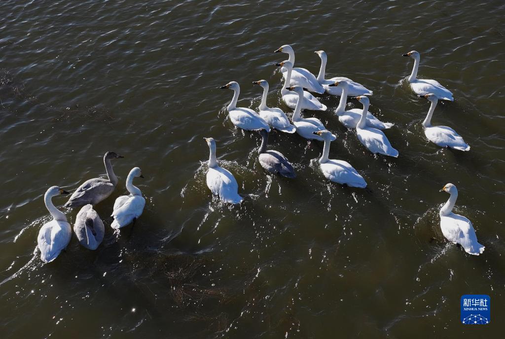 11月25日,天鵝在河北省唐山市豐南區黑沿子鎮沿海濕地水面上游弋(無(wú)人機照片)。