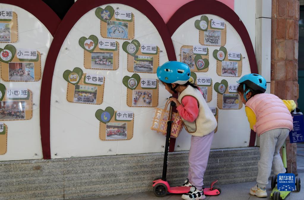 11月24日,在上海市實(shí)驗幼兒園,小朋友被園內宣傳欄的班級照片吸引。