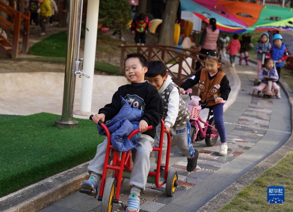 11月24日,在上海市實(shí)驗幼兒園,小朋友在“校園賽道”上騎車(chē)。