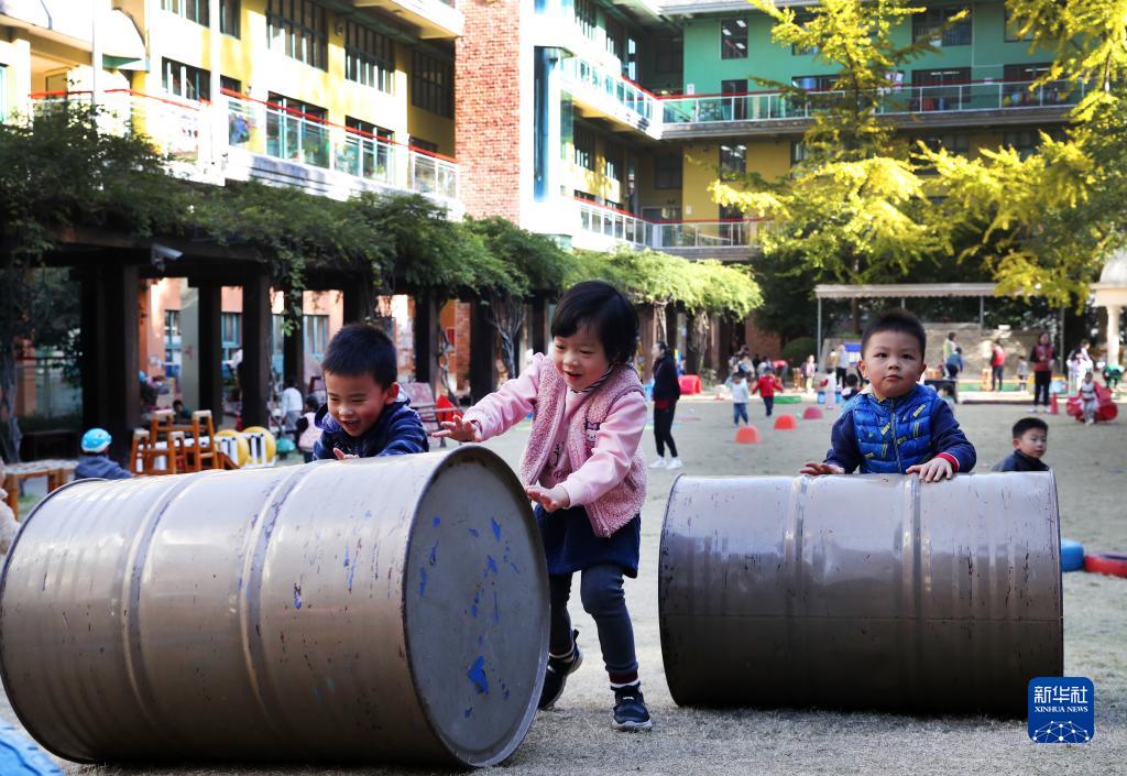 11月24日,在上海市實(shí)驗幼兒園,小朋友玩滾鐵桶游戲。