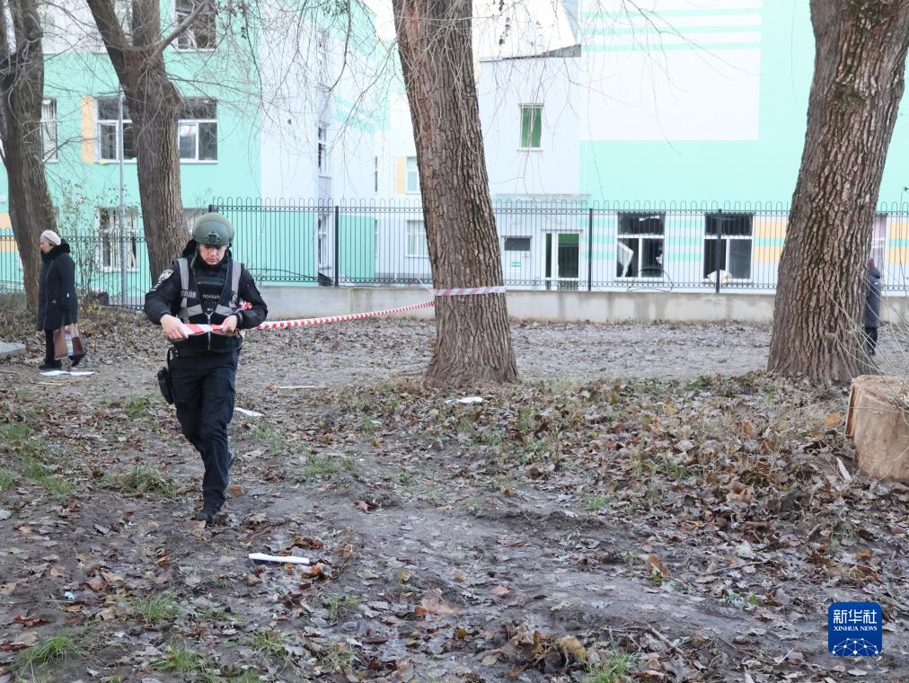 11月25日,在烏克蘭基輔市,執法人員封鎖空襲現場(chǎng)。